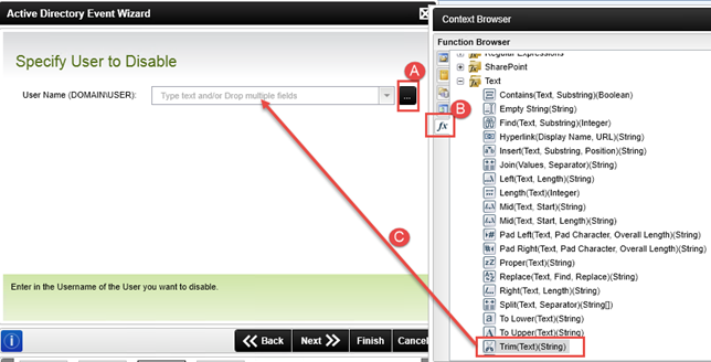 - On the Specify User to Disable screen, drag and drop the Trim inline function into the User Name field. (Once again, you are using the trim in-line function so that any extra spaces are removed, as Active Directory can be particular when it comes to extra spaces.)