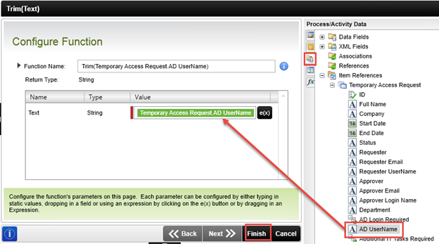 - Configure the Trim function to use the Item References > Temporary Access Request > AD UserName property, then click Finish.