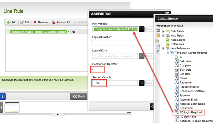 - Add a line between the Set Status Expired activity and the Disable AD Account activity and configure the line rule to only execute if Item References > Temporary Access Request > AD Login Required property is