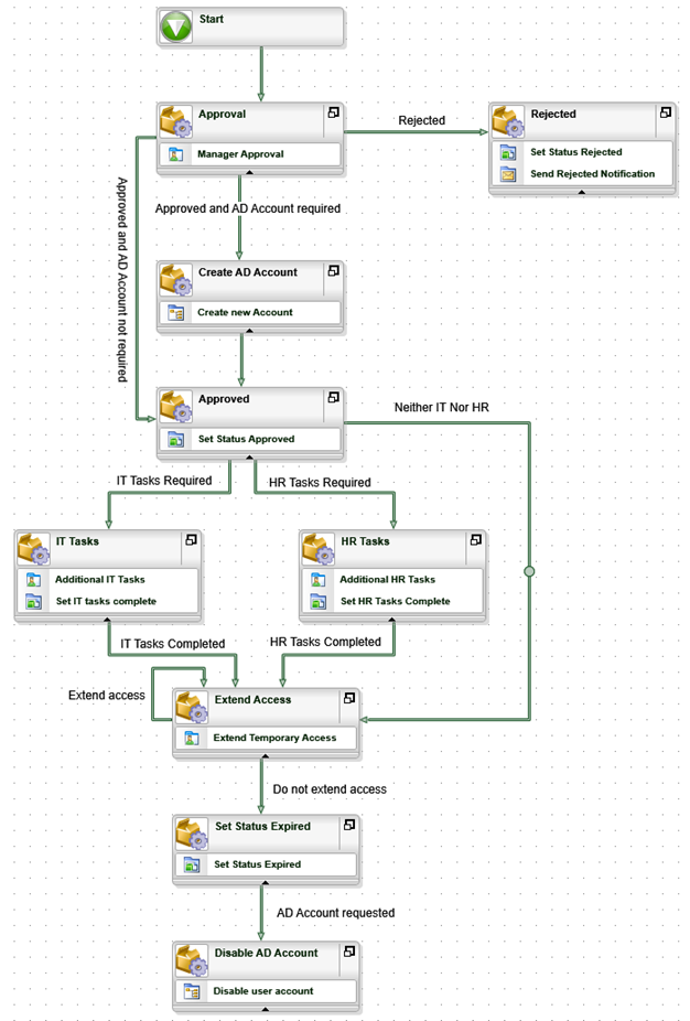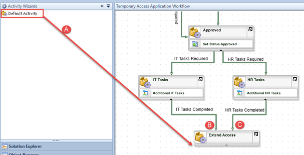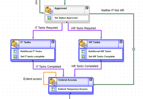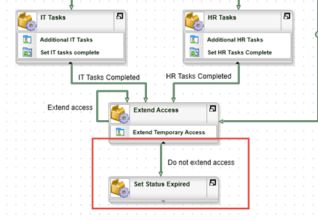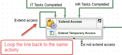 then connect the IT Tasks Completed and HR Tasks Completed lines to the new activity. - Draw a line that goes from Approved to Extend Access, and configure the line rule so that it is followed if BOTH the Additional IT Tasks and Additional HR Tasks properties of the Temporary Access Request Item Reference are False.