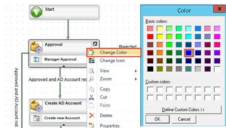 - First you will change the color of all user activities to blue, so that you can easily distinguish activities that require user input from activities that are performed by the K2 server only. Right-click the Approval activity and select the Change Color option. Change the color of the activity to blue.