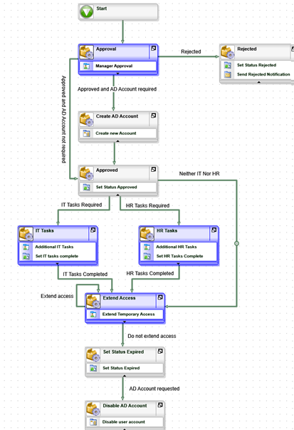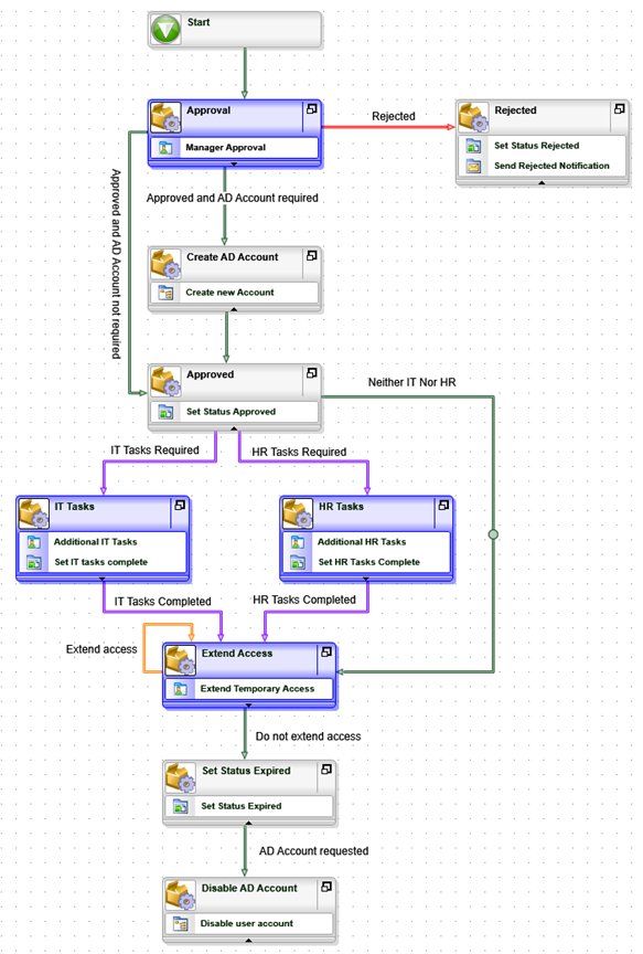 - Use the same approach to change the color of the IT Tasks, HR Tasks and Extend Access activities to blue. Now it is easy to see which tasks in the workflow require user action.