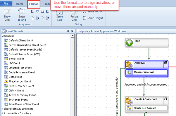 If necessary, move activities around and use the alignment functions so that activities are nicely aligned and separated from one another. Try not to have any activities overlap, and try to lay the workflow out so that lines do not cross over each other. It won’t affect the operation of the workflow if they do, but following these guidelines just makes for an easy-to-understand workflow.