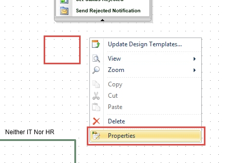 The new line you just added is necessary because the workflow would simply end after the Approved step if the user did not select either the Additional IT Tasks option nor the Additional HR Tasks option on the request form. - Right-click the Extend Access activity and select Properties.