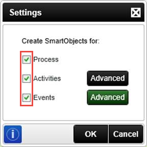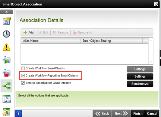 Open the Association tab and confirm that the Create Workflow Reporting SmartObjects option is selected. If it is not selected, CHECK the box to select it, then click the Settings button to the right of that line. CHECK all three options (Process, Activities, Events) then click OK. Click Finish.