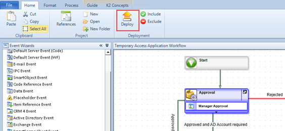 In this step, you will briefly explore the process properties, deploy the workflow to your K2 environment and then give the users in your organization permission to start and report on the workflow.