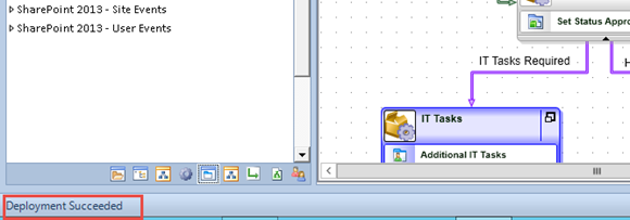 - Click Finish to start deploying the workflow. It may take a few seconds for the workflow to finish deploying. Once the deployment is done, you should see a Deployment Succeeded message in the status bar.