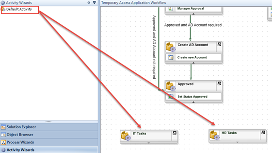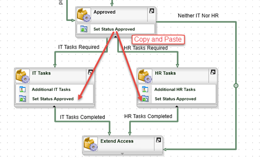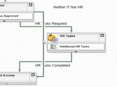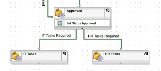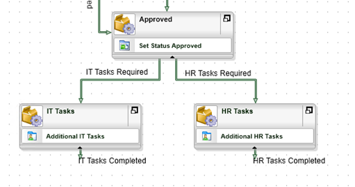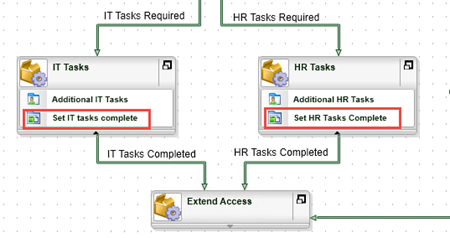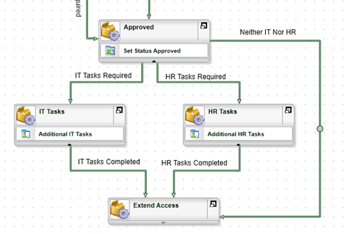 HR Tasks - Add lines to join the Approved activity to the IT Tasks and HR Tasks in parallel and then define line rules to conditionally follow the lines depending on whether the Additional IT Tasks and Additional HR Tasks properties of the Temporary Access Request Item Reference are True.