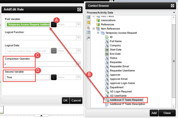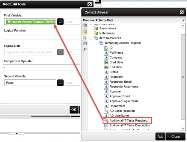 First Variable: Item Reference > Temporary Access Request > Additional IT Tasks Required