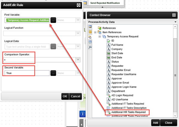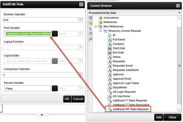 First Variable: Item Reference > Temporary Access Request > Additional HR Tasks Required