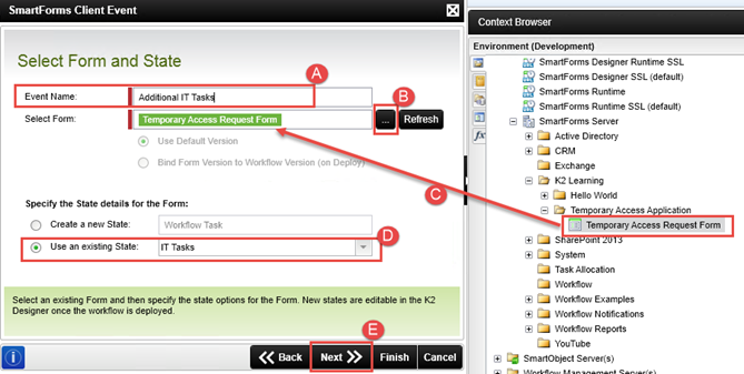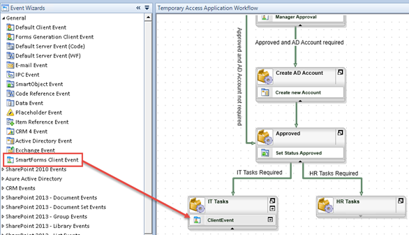 Now that you have set up the rules for your parallel lines, you will add user tasks to both the IT Tasks and HR Tasks activities. The user tasks will require a user from each group to action the task before the workflow can continue. (This is, of course, dependent on whether or not the additional task options where selected on the request form.) - Switch to the Event Wizards pane, then drag and drop a SmartForms Client Event into the IT Tasks activity. Click Next on the wizard welcome page.