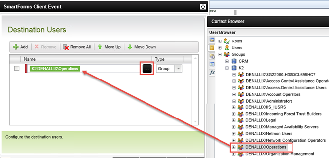 - On the Destination Users screen, click the Add button to add a new destination user, then use the ellipsis button to select the user or group that will perform the IT tasks. In this sample, you will use the Denallix\Operations AD Group, but you may need to select a different group or user if you are using your own environment for this tutorial. You can also select the Originator value found in the Workflow Context Browser > Process Instance node to route the task back to you for convenience in testing, if you prefer. Click Next to continue.
