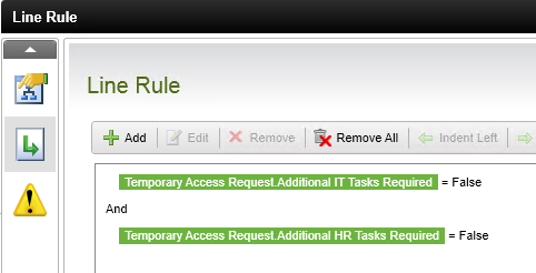 - Next you will set up the HR Tasks line. Using the same steps as before, right-click the HR Tasks Required line, and configure the line rule as follows: