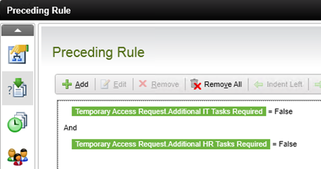 Next you will configure the Extend Access task to only run when both IT Tasks and HR Tasks are complete. This is a requirement when you want to implement a parallel path in a workflow, otherwise the Extend Access task would start once after the IT Tasks are complete and once again when the HR Tasks are complete. You will be adding a preceding rule to the Extend Access task so that it checks that both IT Tasks and HR Tasks are complete before the Extend Access task is started.