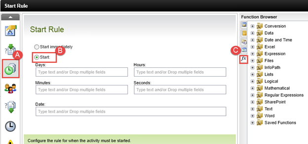 - Select the Start Rule tab, then select the Start option and expand the context browser on the right of the window. Open the Inline Functions tab.