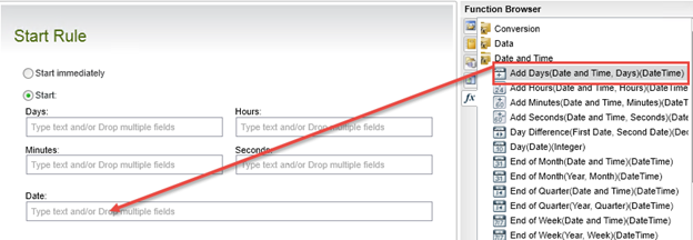 - Drag and drop the Date and Time > Add Days function into the Date textbox.