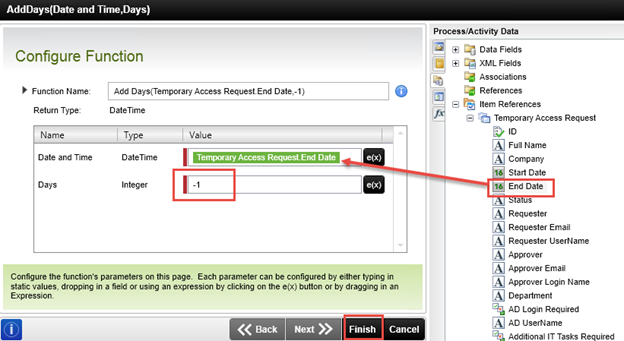 then drag the Item References > Temporary Access Request > End Date property into the Date and Time Value text box, then click Finish. Click Finish once again to close the Extend Access Properties wizard.