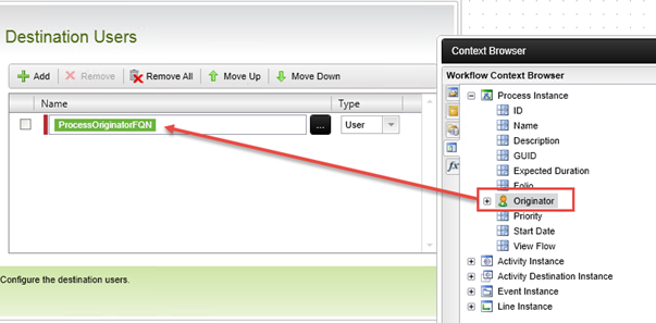 Do not extend accessAction Display Settings (no changes, use default values) Transfer Form Data to Workflow (no changes, use default values) Outcomes (no changes, use default values) Destination User Select the Process Instance > Originator from the Workflow Context tab