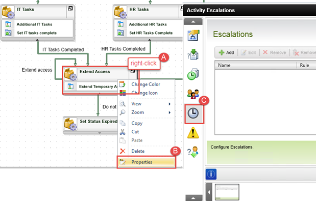 Right-click the Extend Access activity and select Properties, then open the Escalations tab.