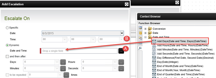 - You want the escalation to fire one day after the end date. On the Escalate On screen, select the Dynamic radio button, then use the ellipsis icon to drag and drop the Add Days inline function into the Date and Time text box.