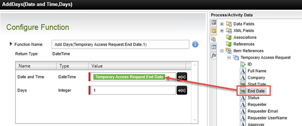 - Configure the function to add one day to the Item References > Temporary Access Request > End Date property, then click Finish. In this step, you are telling K2 that if you reach the end date (day), the wait one day and expire the task if the requester did not extend the end date.