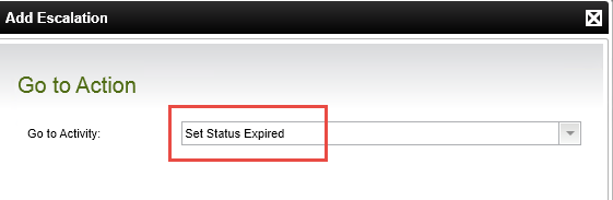 - On the Go to Action screen, select Set Status Expired, then click Next. Click Finish to complete the Escalation wizard, then click Finish to close the activity properties page.