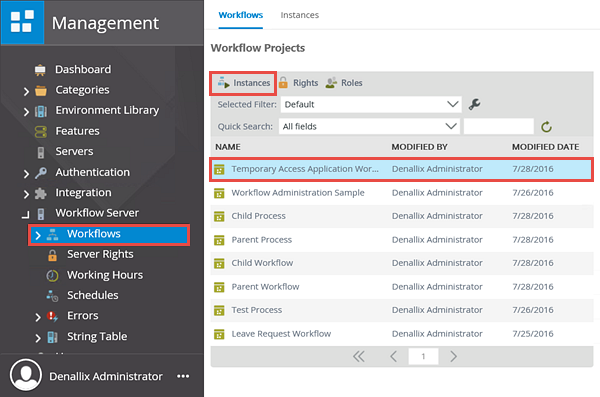 - Expand the Workflow Server node, then click Workflows so that the workflow projects are displayed in the central pane. Locate, then click to highlight, the Temporary Access Application Workflow. Click the Instances button located in the toolbar.
