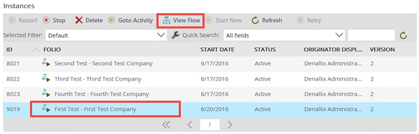 You should see the four instances that you started in the previous step. (The order of your process instances may not match the image below.) You will be opening the View Flow Report for each process instance to observe the current status of the workflow.