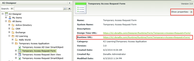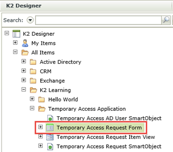 - Locate the K2 Learning > Temporary Access Application folder, then select the Temporary Access Request Form.