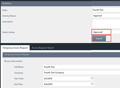 - Open the Fourth Test form, select a date in the future for the End Date, select the Extend Access action and Submit the form.