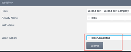 - You should see two tasks for the IT Tasks step (Fourth Test and Second Test). For both tasks, open the task form and then submit the form with the IT Tasks Completed task action.