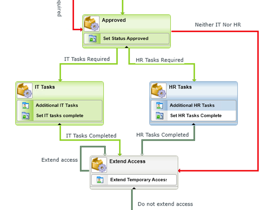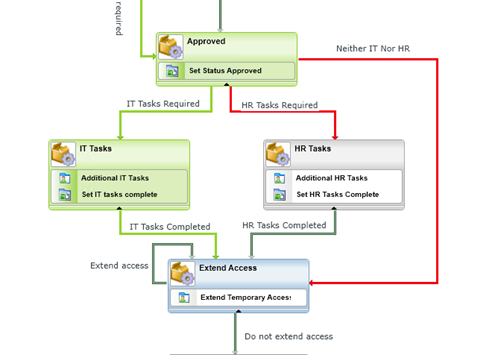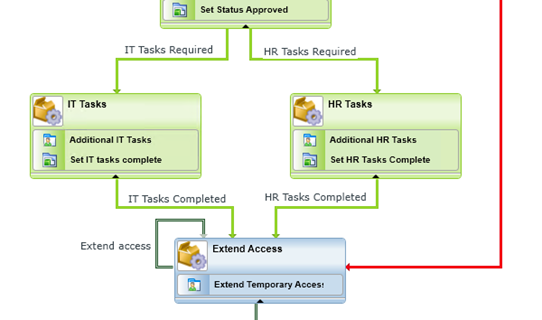 - Return to the View Flow Reports that you left open (or re-open the View Flow Reports for the workflows that you started). For the Second Test workflow, you should see that the IT Tasks step has completed and the workflow moved on to the Extend Access step, because there were no HR Tasks for this request.