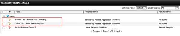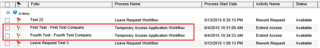 - Open K2 Workspace as the user who initially requested the temporary access. You should see two instances for the temporary access request workflow: First Test and Fourth Test