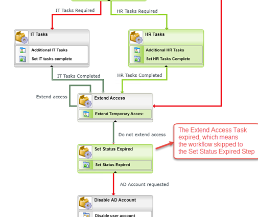 First Test – skipped the Create AD Account step, skipped the IT Tasks Step and skipped the HR Tasks step, and is waiting at the Extend Access step.