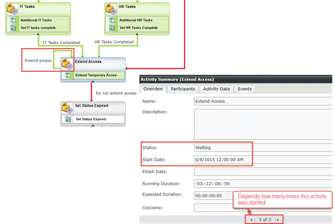 - If you open the View Flow Report for the Fourth Test workflow, you should see that the Extend Access line was followed and the activity looped back to itself. If you double-click the Extend Access step, notice that the status is waiting with a start date sometime in the future, based on the end date you selected. Notice at the bottom of this screen that there are multiple instances of this activity (probably two in our case), because the same activity was started twice. You can click the arrows to move between the reporting data for each instance of the activity.
