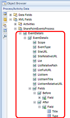 Holds data related to the event that was fired for the SharePoint Item or List. The EventDetails XML datafield added by the wizard represents details about the event that caused the workflow to start. The structure of this XML field is shown in the screenshot below and the table following describes the fields.