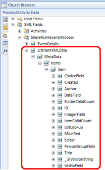 As part of the Events Integration and SharePoint Workflow Integration process wizards, you can also elect to save metadata from the list item to the workflow. You can select individual data values and save them to discrete data fields in the workflow, or instruct K2 to generate a XML datafield that will automatically store all the metadata for the list item. The structure of this data field will depend on the definition of the list or library where the item is created, so we cannot provide a definitive screenshot or explanation of the structure. However, the screenshot and table below describe an example of this XML datafield for a sample list