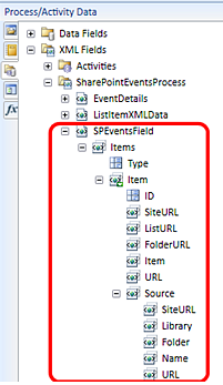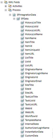 The following process-level XML data fields are created once the SharePoint Events Integration wizard completes. The SharePoint Events Process wizard is used to start a K2 process automatically based on events that occur in lists and libraries in SharePoint