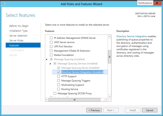 For further information regarding MSMQ and Windows Server integration see the TechNet article Enable Microsoft Message Queuing (MSMQ)