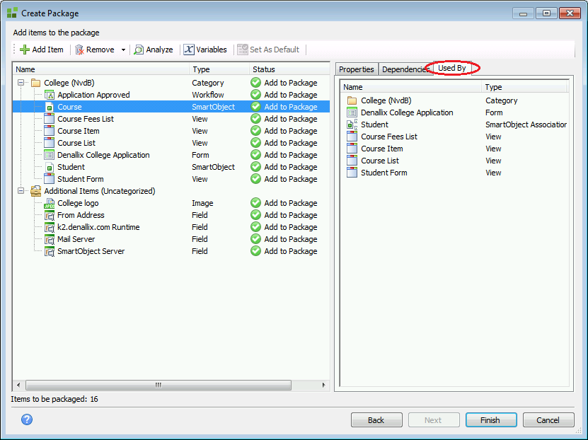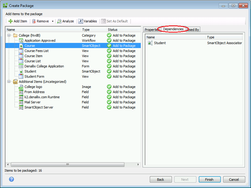 The Automatically include dependent items check box should only be deselected by administrator-level developers who have advanced knowledge of K2 systems. If this check box is deselected, K2 Package and Deployment will not check for artifact dependencies. This means that resulting packages may be created with dependency issues. Deploying a package with dependency issues may cause system errors. Workflows and SmartObjects have many levels of dependencies, and not including a given association or service instance could have serious consequences. If you deselect the Automatically include dependent items check box, you must manually expand and select each of the nodes and sub-nodes of the artifacts you wish to include in the package.