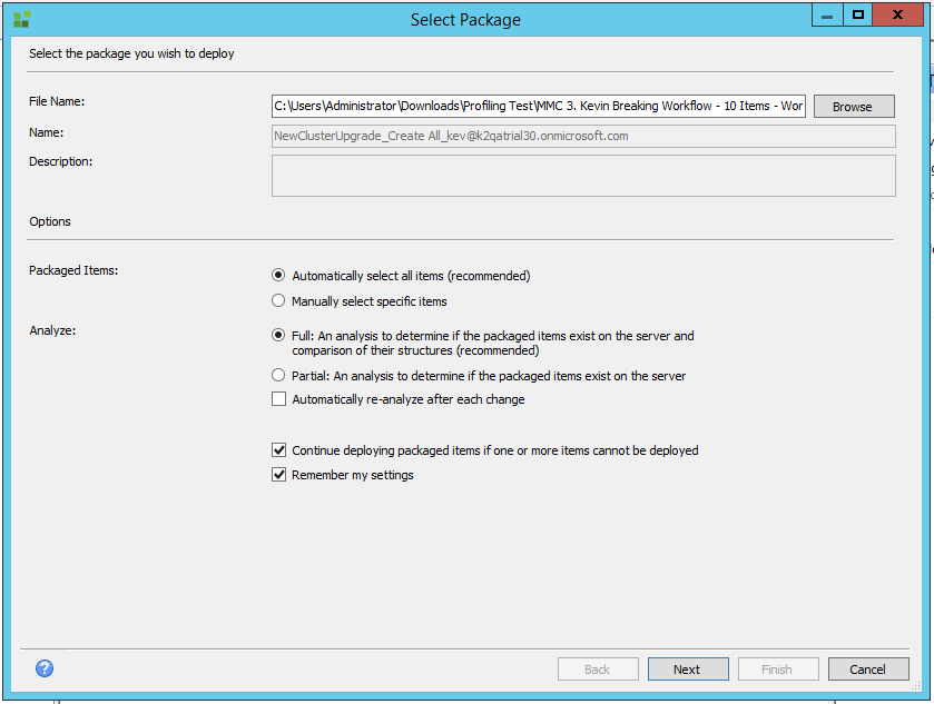 - The Remember my settings check box is checked by default. This allows K2 Package and Deployment to remember which package-selection options have been specified for the current package, and apply the options to future package deployments.
