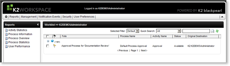 Once the Workflow has been submitted for approval the specified approver will be sent a task notification which can be accessed in K2 Workspace as well as in Management Console as shown below.