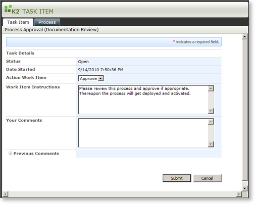 | Designers > K2 Designer for SharePoint 2010 > Deploying a workflow > Setting Process Approval > Using the Process Approval Functionality > Approving the workflow | Send feedback |