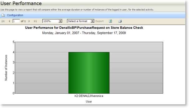 After selecting the Process to be reported on, the Report will be displayed. The Report can be printed or exported to various formats. The Configuration provides an interface where Filters can be added to only view specific data according to the specified criteria and where Parameters can be set to define what the report should display and in what format.