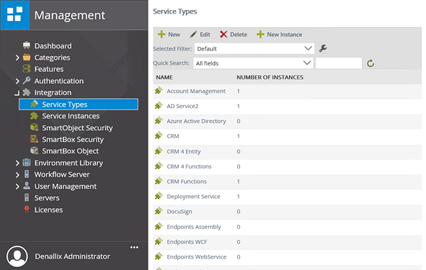 - Click Service Instances. The current service instances are displayed in the central pane. Here you can add new service instances, edit existing service instances, delete and refresh service instances. From this page, you can also generate new SmartObjects from a service instance. Notice that the service instances are displayed with their associated service type.
