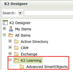 - In the K2 Designer category browser, either create or confirm there is a category called K2 Learning under All Items. Create a new category under K2 Learning and name it