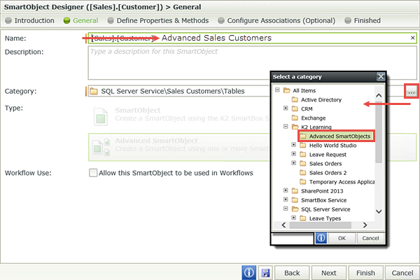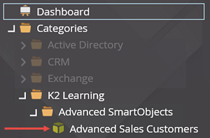 - Expand the Categories node, then expand the K2 Learning > Advanced SmartObjects node. Notice the Advanced Sales Customers SmartObject.