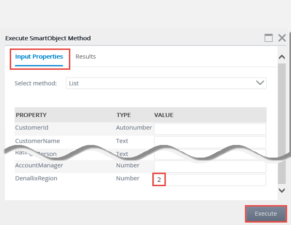 - On the Execute SmartObject Method screen, click Execute without entering any input properties. Review the results that are returned.