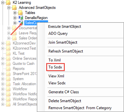 then move the SmartObject to the K2 Learning > Advanced SmartObjects category. - Navigate back to the K2 Management site and locate the Advanced Sales Customers SmartObject in the Categories > K2 Learning > Advanced SmartObjects node. (You will need to refresh the Categories by right-clicking the name and selecting Refresh Menu.)