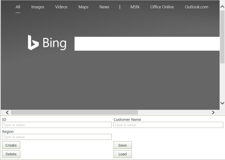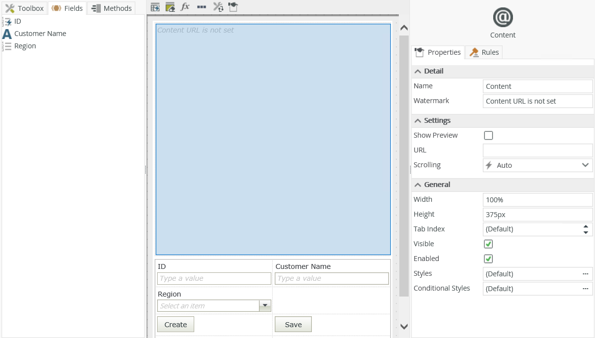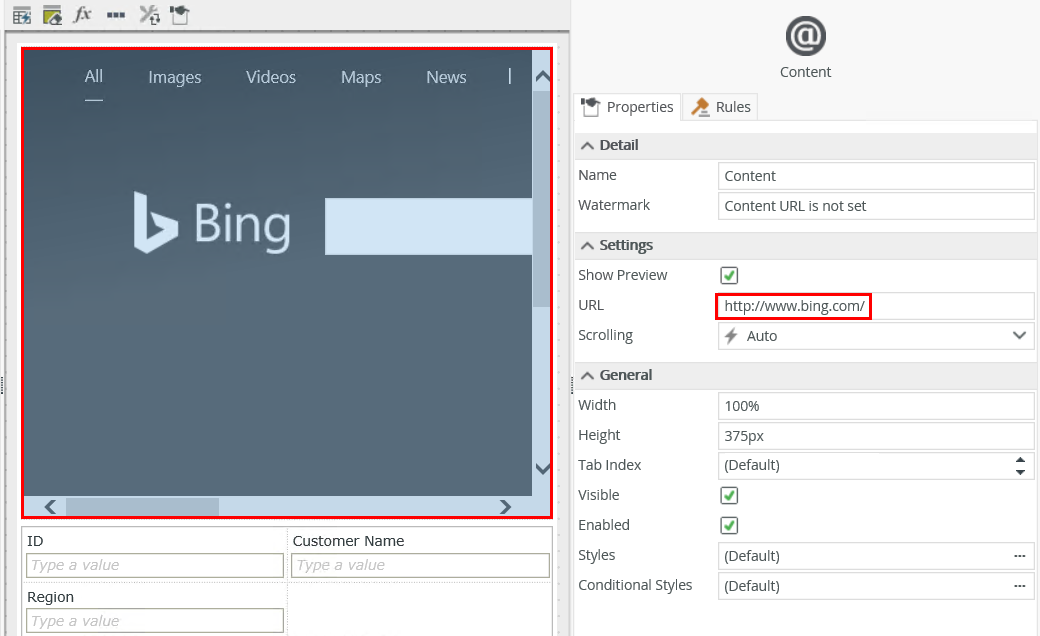The Content control is an inline frame (iframe) that represents a nested browser, allowing you to embed another view, form, or website into your current view or form. Each control contains its own browsing context, with session history and the active page. You can also use the control to insert content from another source, such as an advertisement, into a view or form. Although an iframe behaves like an inline image, you can configure it with its own scroll bar which is independent of the view or form's scroll bar. The control contains a refresh method which you can use with an Execute a control's method rule action to refresh the content. Here is an example form with a content control and a customer view.